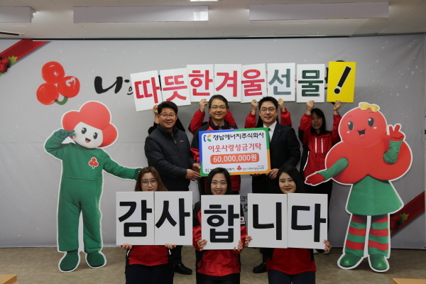 이번 성금은 경남에너지의 임직원과 회사가 매칭그랜트 방식으로 불우이웃돕기 성금 6천만원을 조성하여 경남사회복지공동모금회에 전달하는 등 사랑의 온도탑 온도 올리기에 적극 동참했다.