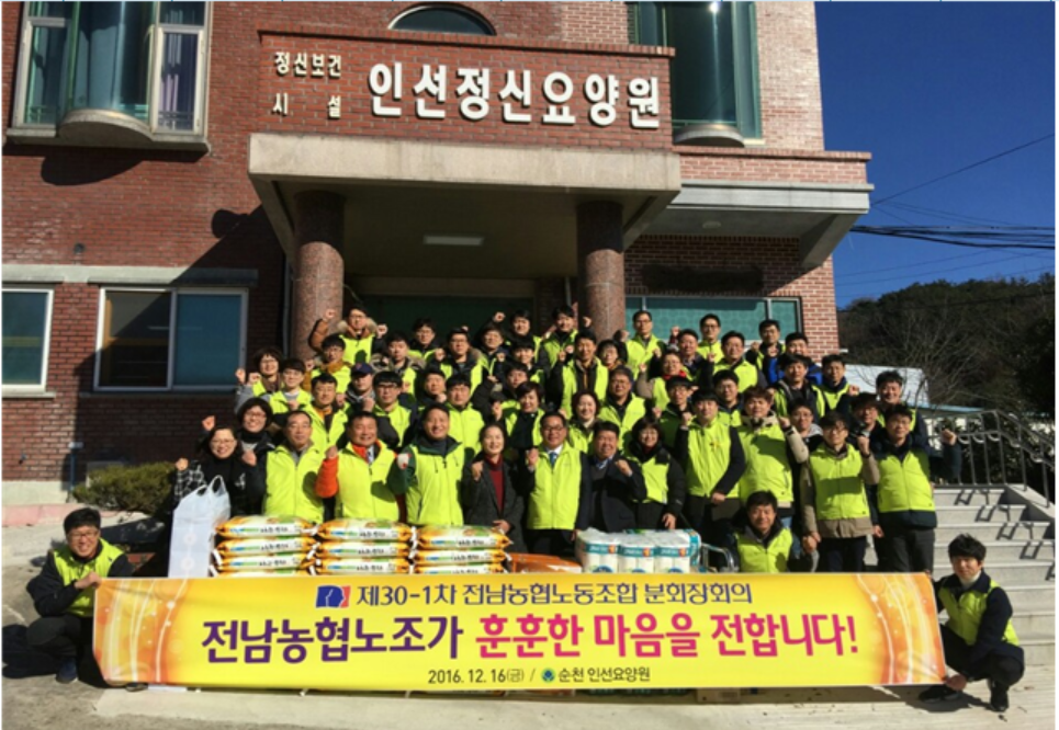 주재범 위원장은“연말연시 어렵고 소외된 이웃들에게 전남농협노조에서 조금이나마 위로를 드리기 위해 봉사활동과 후원품을 준비했다”며 “앞으로도 사회공헌 활동을 지속적으로 전개하겠다”고 말했다.