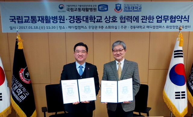 경동대학교(총장 전성용)와 국립교통재활병원(병원장 양승한)은 18일 강원 원주시 문막 메디컬캠퍼스에서 업무 협약을 체결하고 전문기술 인력양성과 임상실습 지원에 나선다.