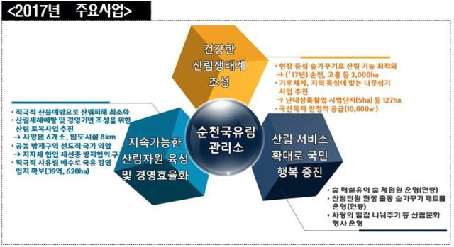 전남 여수시, 순천시, 광양시, 담양군, 곡성군, 구례군, 고흥군, 보성군, 화순군 등 9개 시·군의 산림사업을 관장하는 순천국유림관리소가 국비 145억 원을 투입해 산림보호·조림·숲가꾸기·사유림매수·산림문화 등의 사업을 추진한다.
