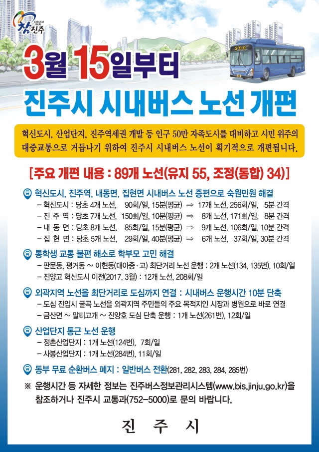 이번 개편의 주요 내용은 기존 100개의 시내버스 노선 중 11개의 중복노선을 통합‧조정해 89개 노선으로 간결하게 만들고, 시내버스 운행이 필요한 혁신도시, 진주역, 내동면, 집현면에 노선을 증편하고, 통학생 노선 신설을 통해 학부모의 고민을 해결함은 물론, 외곽지역 노선을 최단거리로 도심까지 연결해 이용객의 통행시간을 단축하고, 산업단지 통근 노선을 운행해 근로여건 개선에 크게 기여하게 된다.