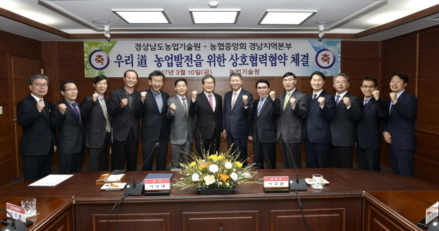 경남도농기원(원장 이상대)과 농협중앙회경남지역본부(본부장 이구환)는 10일 오전 11시 경남도농기원 2층 회의실에서 경남도 농업 연구·개발(R&D) 결과와 기술정보 공유를 통한 6차 산업촉진과 수출농업 지원 등 유기적 협조체계 구축을 위해 상호협력 협약(MOU)을 체결했다.