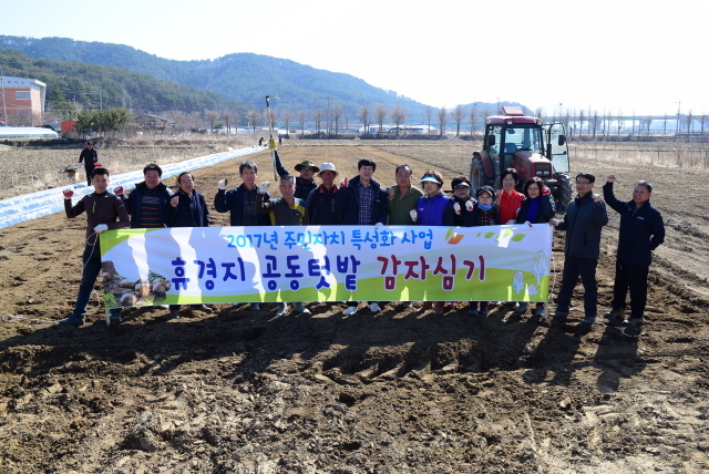 꽃샘추위와 매서운 바람에도 불구하고 아침 일찍부터 주민자치위원 25명과 면사무소 직원 10명이 합심해 1600㎡ 규모의 부지에 감자종자를 파종하고 비닐을 씌우는 공동 작업을 실시했다.