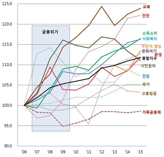 개별 지표별로 이번 조사 결과를 살펴보면, 2015년 교육(23.9%), 안전(22.2%) 영역 지수는 2006년보다 20% 이상의 높은 증가율을 보였다. 소득·소비(16.5%), 사회복지(16.3%), 문화·여가(12.7%), 환경(11.9%), 시민참여(11.1%) 영역 지수는 종합지수 수준이었다.