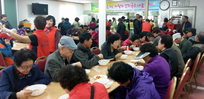 여수시 미평종합사회복지관에서 열린 ‘사랑의 잔치국수 나눔행사’에서 어르신들이 국수를 드시고 있다. 환경공해추방운동호남본부(본부장 이형은)가 주관하고 이마트여수점이 후원해 400인분의 잔치국수를 마련했다.
