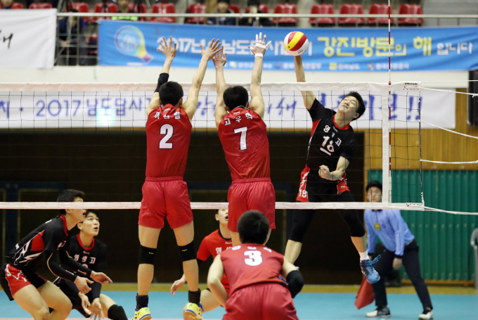 전남 강진군에서 46개 팀이 참가한 가운데 개막된 ‘2017 춘계 남·녀 중·고 배구연맹전’ 사흘째인 19일 강진국민체육센터 실내체육관에서 영생고와 속초고 선수들이 경기를 펼치고 있다.