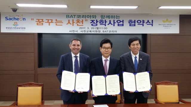 사천시청에서 진행된 이번 협약식에는 사천시장 송도근, 사천교육지원청 교육장 김정규, BAT 코리아 토니 헤이워드 사장이 자리를 함께하고 사천시 인재 육성을 위한 다양한 장학사업에 적극적으로 협력하기로 했다.