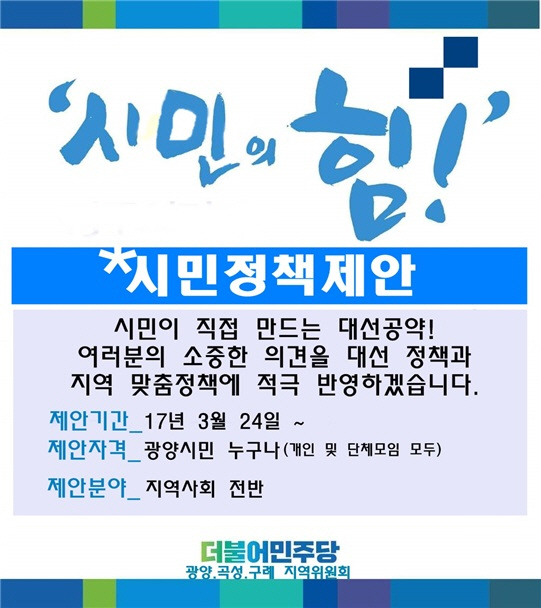 더불어민주당 광양곡성구례지역위(이하 지역위)는 오는 5월 9일 치러지는 제19대 대선에 시민이 제안하는 정책들이 민주당의 대선공약으로 반영될 수 있게 시민정책공모를 시작한다고 밝혔다.