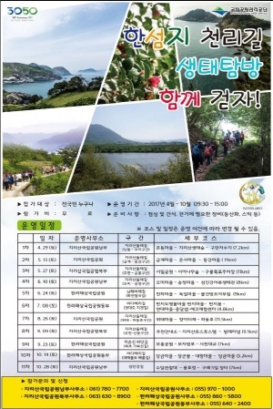 올해는 공단 창립 30주년, 국립공원 제도 도입 50주년이 되는 뜻깊은 해로 ‘국립공원 3050 기념’지리산둘레길, 섬진강길, 남해바래길, 바다백리길 등 산과 강, 바다를 이어주는 한섬지 천리길을 탐방하고 지역의 역사, 문화, 생태 등에 대한 재미있고 생생한 이야기를 지역 주민가이드에게 직접 들을 수 있다.