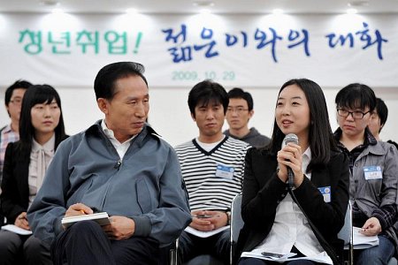 이 대통령은 "외국은 경제위기 오니까 다 해고시켰는데 우리는 봉급을 깎고 시간을 줄여 일자리를 유지하는 잡쉐어링을 했다"며 "외국에서는 실패할 것이라고 내다보는 사람들도 있었지만, 1년 지나고 지금 와서 많은 정상들이 '한국이 특수하다'고 하더라"고 말했다.