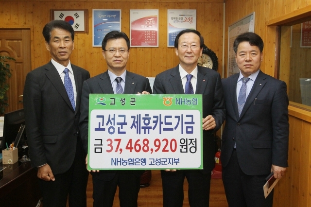 NH농협 고성군지부 최명호 지부장은 29일, 고성군청을 방문해 최평호 군수에게 제휴카드 적립 기금 3746만 원을 전달했다.