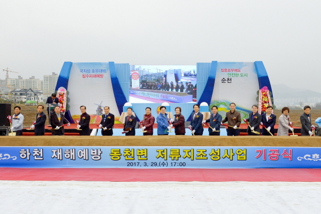순천시가 하천 재해예방을 위한 동천 저류지 조성사업 기공식을 29일 오천택지 옆 저류지 주차장에서 가졌다.