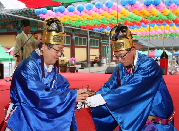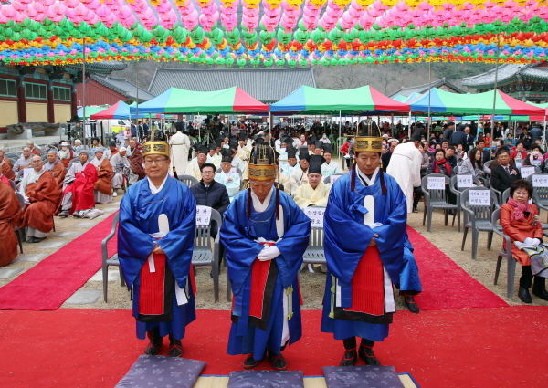 박일호 밀양시장(왼쪽 첫번째)이 31일 오전 11시 표충사 경내에 있는 표충서원에서 임진왜란 때 의승장으로 구국의 대공을 세우신 서산, 사명, 기허 3대사의 호국충정을 기리는 사명대사 춘계향사에 초헌관으로 제향을 봉행하고 있다.