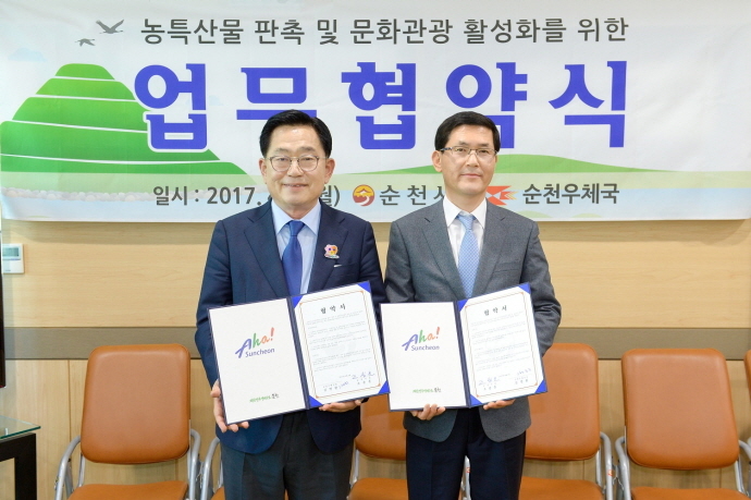 시와 순천우체국은 3일 순천시청에서 업무협약식을 갖고 지역 농산물 공동상표인 ‘순천미인’과 농특산물을 전국 3500여 우체국을 통해 적극 홍보하고 판촉해 농가소득 증대 및 지역경제 활성화, 문화관광산업 발전에 적극 협력해 나가기로 했다.