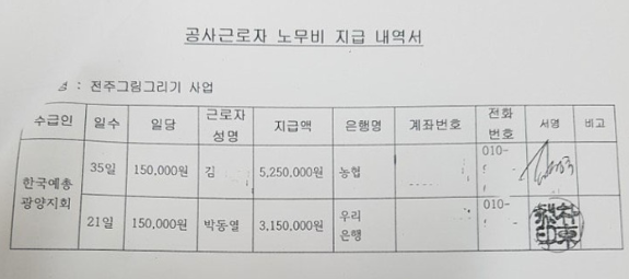 박 회장은 광양예총 명의로 이 사업을 발주 받은 다음 1455만원(부가세 포함)의 사업비 중 재료비(453만 2000여원)를 포함한 950만원을 광양미협 회원인 김 모 씨에게 사업 추진비로 지불하고 나머지 금액 중 315만원을 자신의 노무비 명목으로 착복한 것으로 확인됐다.