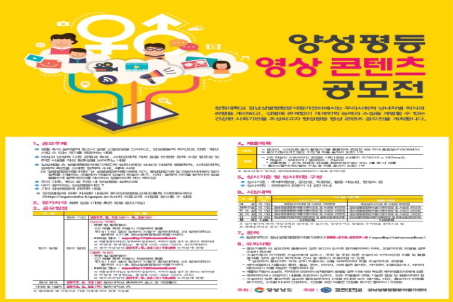 경남 창원대학교는 오는 12일 우리사회의 만연해 있는 남.녀차별 의식과 관행을 개선하고, 성별에 관계없이 개개인의 능력과 소질을 발휘하는 건강한 사회기반 조성을 위한 '2017 양성평등 영상 콘텐츠 공모전'을 연다고 밝혔다.