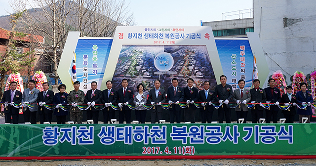 강원 태백시는 11일 황지연못 인근 물길복업 사업 현장에서 김연식 태백시장, 심용보 시의장, 시·도의원, 박미자 원주지방환경청장, 도 관계자, 기관·사회단체장, 주민 등 400여 명이 참석한 가운데 황지천 생태하천 복원공사 기공식을 가졌다.