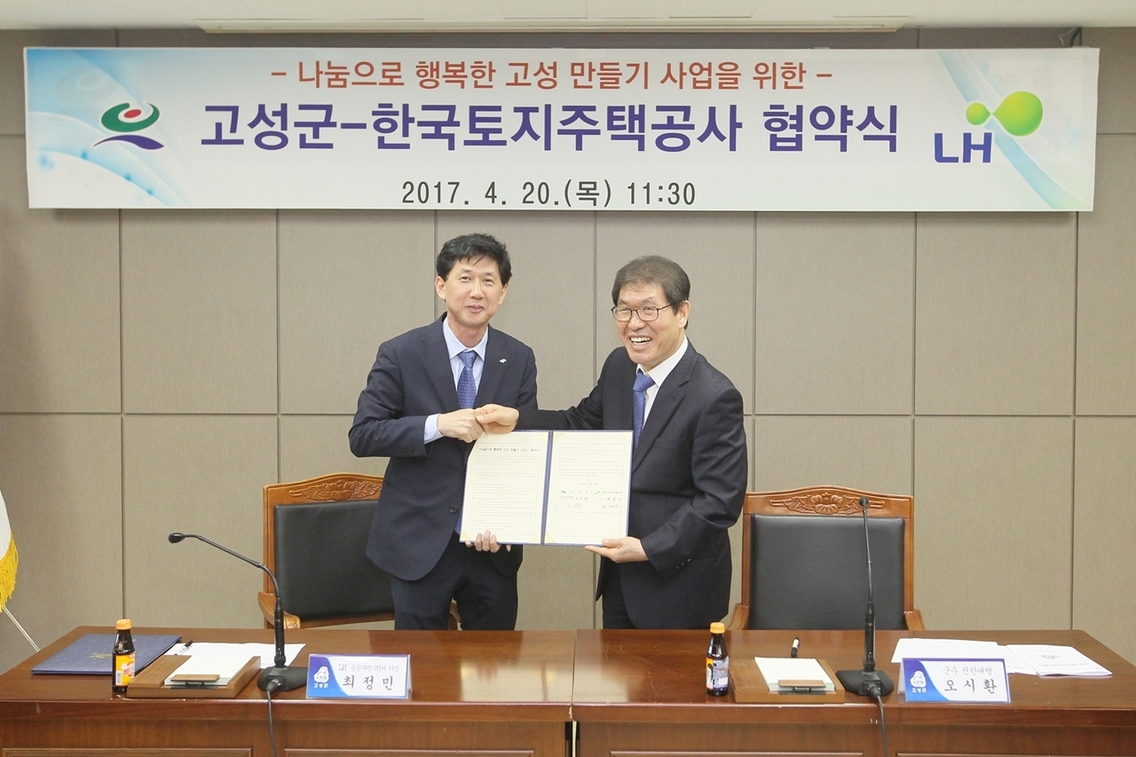 경남 고성군과 한국토지주택공사는 20일 오전 11시 30분, 군청 중회의실에서 ‘나눔으로 행복한 고성 만들기 사업’ 업무 협약을 체결했다.
