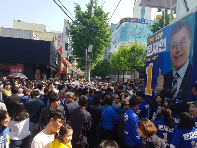 또 황금연휴 첫날인데도 젊은층을 비롯해 중장년과 가족을 동반한 시민들은 직접 만든 손피켓을 흔들고 엄지척을 보이며 문 후보를 환호했다.