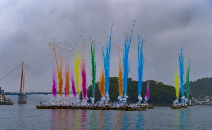 축제 둘째 날인 5일에는 종포해양공원 앞 해상에서 이순신 장군이 이끄는 전라좌수영의 1차 출정 모습이 생생하게 재현됐다.