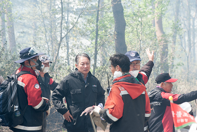 김연식 강원 태백시장은 8일 산불발생 피해지역 현장을 찾아 인력과 장비를 투입하는 등 산불진화에 총력을 기울이고 있다.