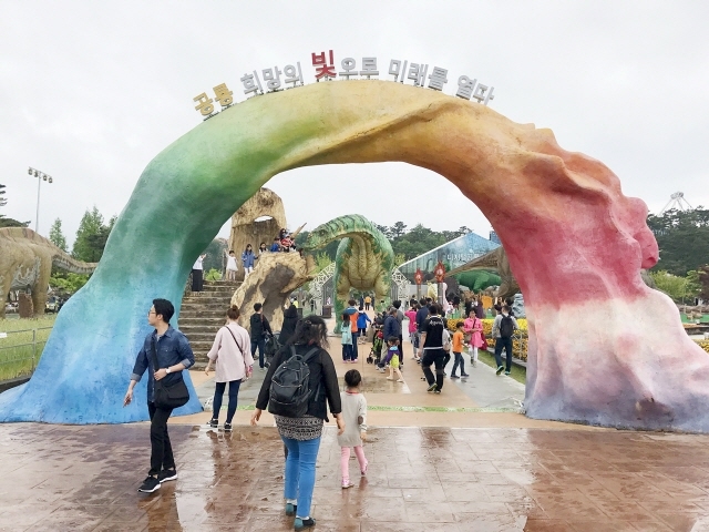 고성공룡박물관은 중생대 공룡들이 살아 움직이는 모습을 재현한 공룡조형물과 토피어리 공원, 공룡발자국 화석, 주상절리의 병풍바위 등 공룡과 자연을 함께 즐기려는 관람객들로 인산인해를 이뤘다.
