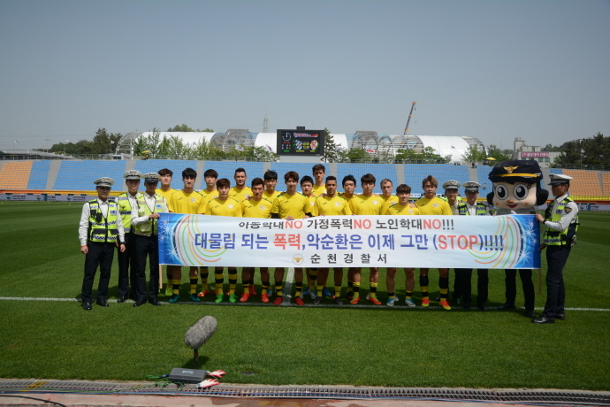 순천경찰서(서장 김홍균)는 지난 7일 5월 가정의 달을 맞아 프로축구 경기가 열리는 순천 팔마종합운동경기장에서 전남드래곤즈 선수들과 함께‘아동학대 No 가정폭력 No 노인학대 No’홍보활동을 전개하였다.