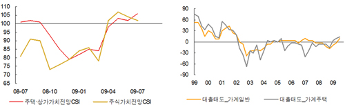 | ▲ 왼쪽은 한국은행이 발표하는 소비자 심리지수 중 부동산과 주식 가치 전망의 변화를, 오른쪽은 월별 금융기관 대출태도 지수 변화를 보여준다. 가계와 금융권 양쪽이 부동산의 가치 상승에 대해 긍정적인 해석을 보이고 있다. ⓒKTB투자증권 제공 |