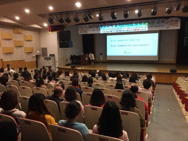 경남 고성군은 16일 오후 6시 30분, 고성군문화체육센터에서 영유아 부모 및 어린이집 보육교직원 200여 명을 대상으로 부모 교육을 했다.
