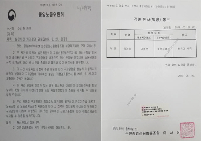또 중앙노동위원회 부당 대기발령 판정 통보를 받은 순천중앙신협은 5월 26일까지 이행결과통보서를 제출하기 위해 지난 15일 회의를 거쳐 김 모 직원에게 오는 22일부터 원직에 복직 하라는 인사 조치를 취한 것으로 확인됐다.