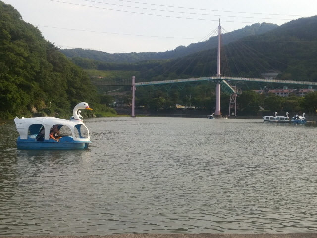 최고 온도 29도를 기록한 경남 의령군에 주말 가족나들이객들이 의령천을 찾아 오리배를 타며 즐거운 시간을 보내고 있다. 넉넉한 남산의 정취와 시원한 바람을 머금은 의령천의 냇물이 내방객들에게 지친 일상의 피곤함을 잊게하는 여유를 선물한다.