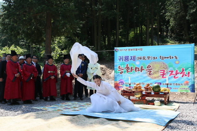사천시 사남면 능화마을 역사문화회(회장 구진도 이장)는 22일 고려 8대 임금 현종의 아버지 안종의 능지가 있는 능화봉 산하에서 송도근 사천시장을 비롯한 역사․문화관련 기관단체장과 출양인사를 모시고 ‘안종 품은 능화봉, 천년의 숨결을 잇다’라는 주제로 제1회 귀룡제와 함께하는 능화마을 큰잔치를 열었다.