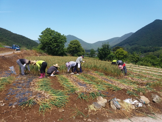 이날 공무원 20여 명은 이른 아침부터 농가를 찾아 마늘 수확 작업에 구슬땀을 흘렸다.
