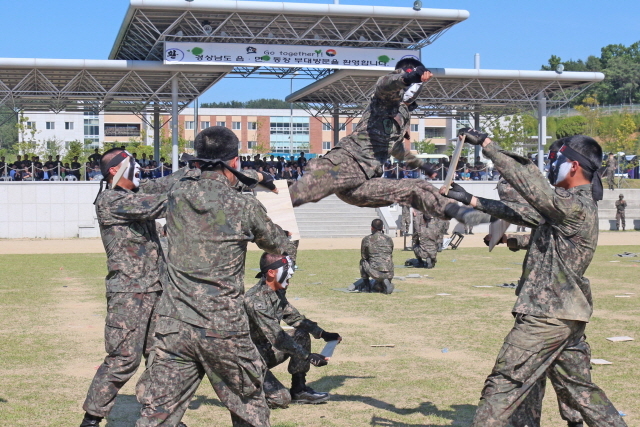 ▲39사단에서 열린 경상남도 읍·면·동장 부대초청행사에서 사단 장병들이 특공무술 시범을 보이고 있다. ⓒ육군제39사단