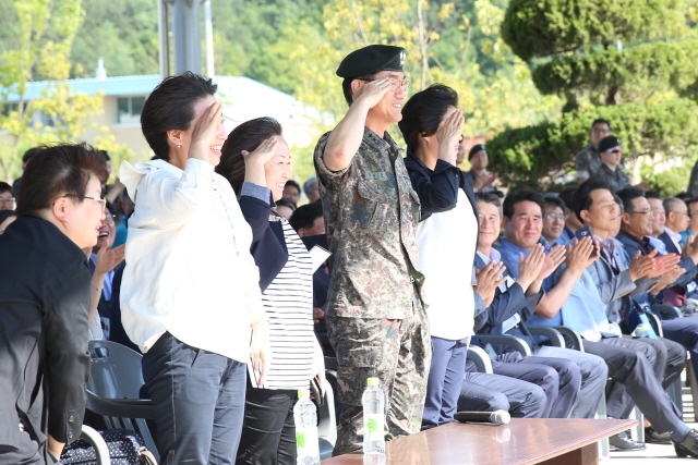 ▲39사단에서 열린 경상남도 읍·면·동장 부대초청행사에서 참석자들이 특공무술 시범을 보인 장병들의 경례에 문병호 사단장과 함께 답례하고 있다. ⓒ육군제39사단
