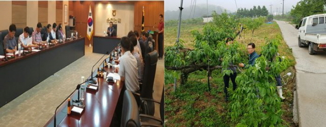 특히 주요 생산품목인 매실, 배, 복숭아, 참다래, 고추 등 약 540ha의 낙과와 과피 및 잎손상 피해를 입어 지난 1일 비상대책회의를 갖고 피해농가의 경영안정과 농작물 피해복구를 위해 피해복구비 1억 원을 긴급 투입하기로 결정하고 2일부터 본격적인 지원에 나섰다.