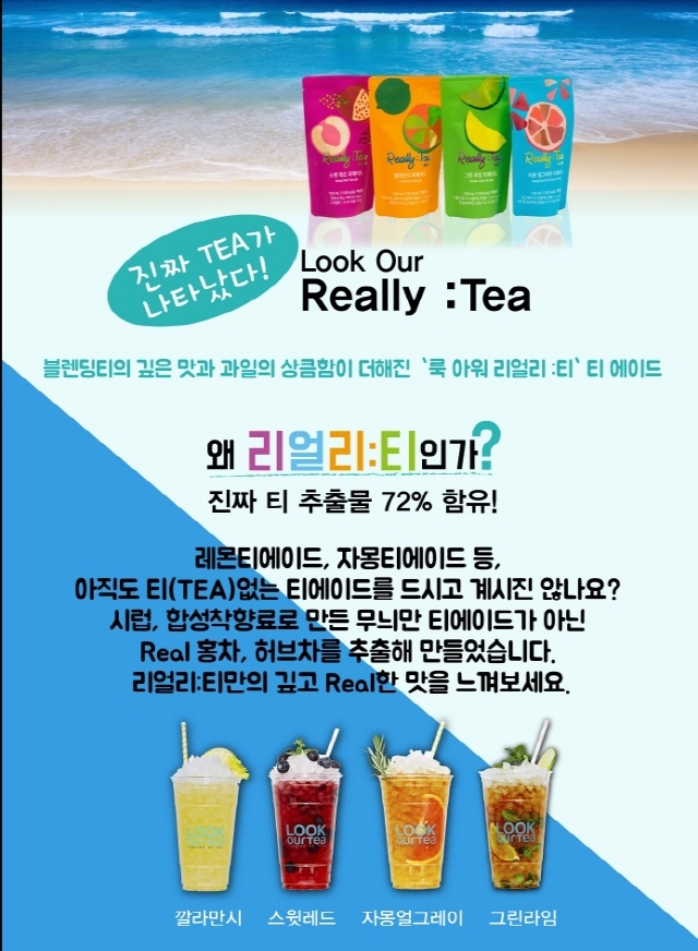 청량한 색감에 전문화를 더한 ‘룩아워 리얼리티’ 티 에이드는 블랜딩티의 깊은 맛과 과일의 상큼함이 더해져 산뜻하다. 시럽, 합성착향료로 만든 무늬만 티에이드가 아닌 리얼홍차, 허브차를 추출해 만들었다.