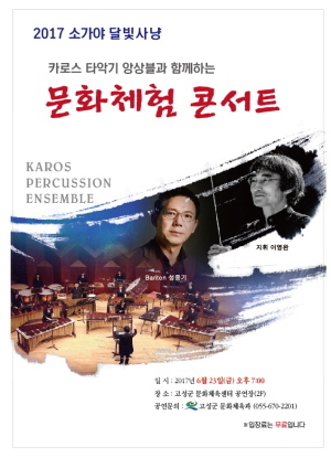 ‘카로스 타악기 앙상블과 함께하는 문화체험 콘서트’를 주제로 열리는 이번 공연은 군민들에게 문화 향유의 기회를 제공하기 위해 마련됐다.