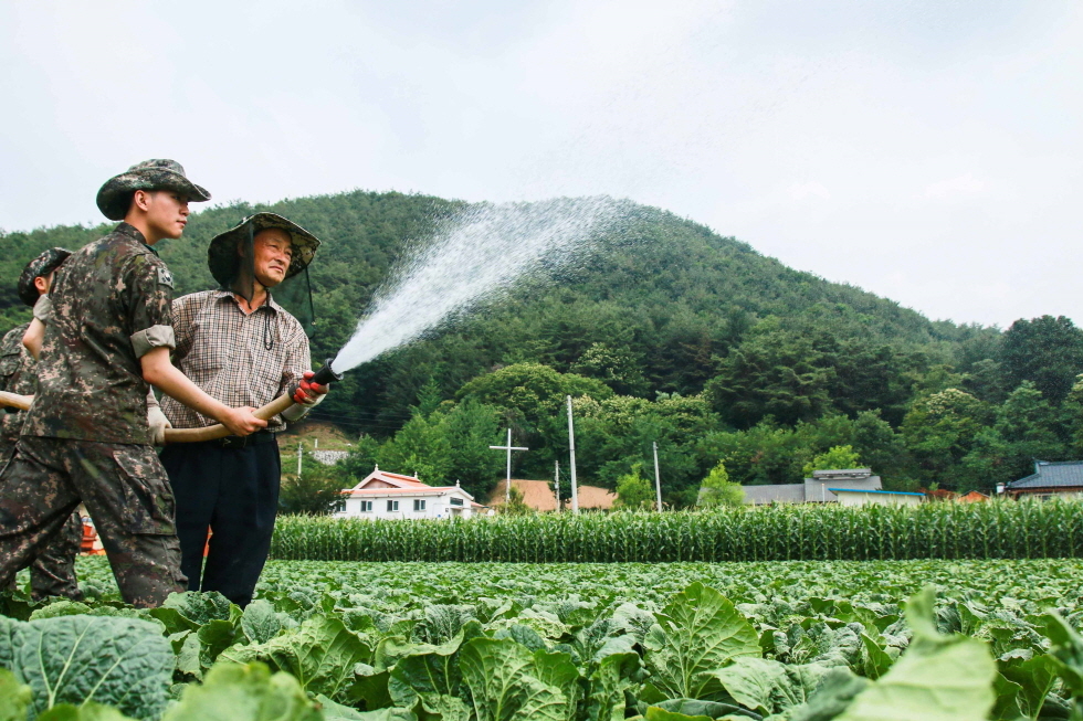 ▲20일 육군 제 11사단 장병들이 최근 가뭄이 지속되자 홍천지역 김천학 씨(65)의 배추밭과 옥수수 밭에 물을 공급해 주고 있다. ⓒ 육군 제 11사단