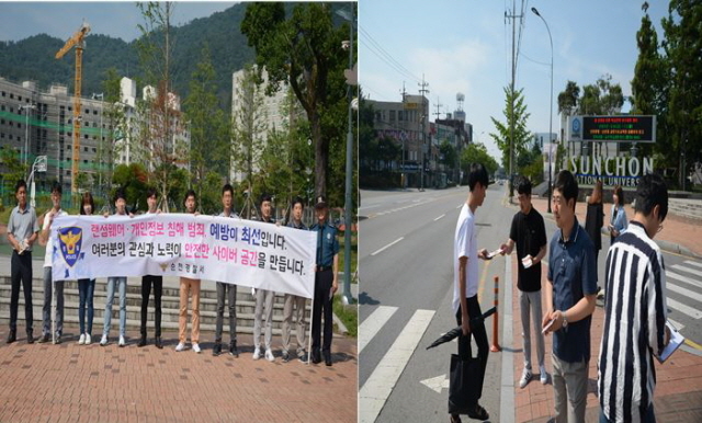경찰서는 지난 21일 순천대 정문일대에서 사이버범죄 수사팀장 등 경찰관 15명이 참석한 가운데 학생들과 주민들을 상대로 ‘사이버범죄 예방’ 홍보를 위해 전단지 배포했다.