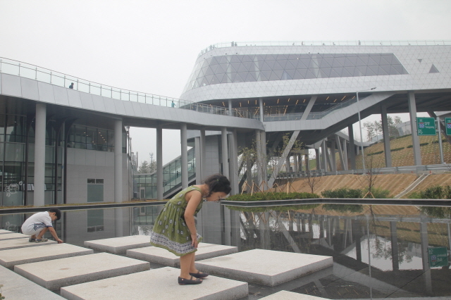휴게소 건물을 나오면 건물 옆에 작은 연못이 있다. 맑은 물 위에 징검다리를 닮은 정사각형의 질서정연한 콘크리트 구조물이 연못 한켠에 놓여있어 여행을 나선 아이들이 너무 즐거워한다.