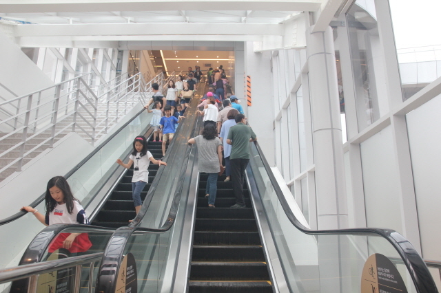멀리서 보면 공항 같다. 비행기 앞 몸체 같은 건물이 도로 위를 길게 뻗어 있고, 그 앞에 앞날개 같은 휴게소 건물에 음식점과 깨끗한 화장실이 배치되어 있다. 그리고 2층으로 올라가는 긴 에스컬레이트가 고속도로 휴게소에서는 처음으로 설치되어 마치 공항 로비 같다.
