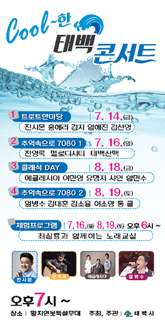 더불어 오는 16일과 8월 19일 오후 6시에는 쿨~한 태백 콘서트 주말체험프로그램으로 태백시민과 관광객을 대상으로 ‘최삼룡과 함께하는 노래교실’이 진행된다.