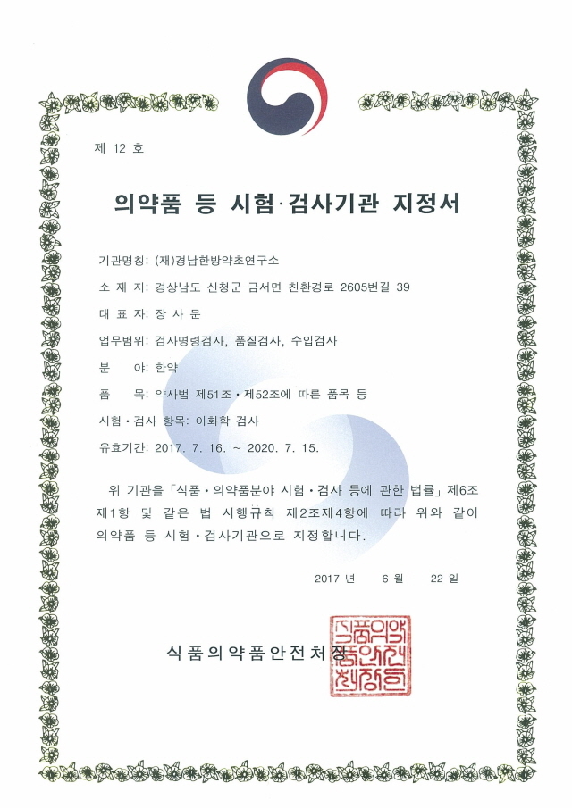 ▲의약품 등 시험.검사기관 지정서. ⓒ경남한방약초연구소