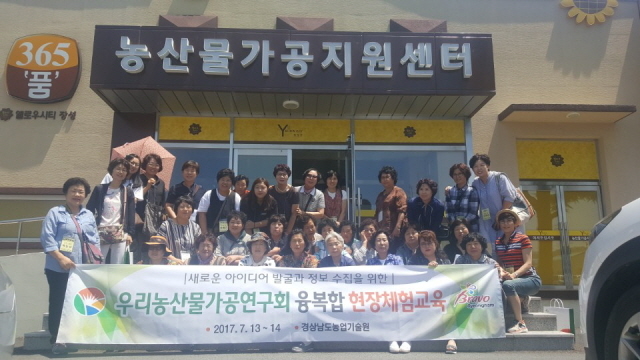 ▲우리농산물가공연구회원들이 지난 13~14일 현장체험교육을 실시하며 농산물가공지원센터에서 기념촬영을 하고 있다. ⓒ경남도농기원