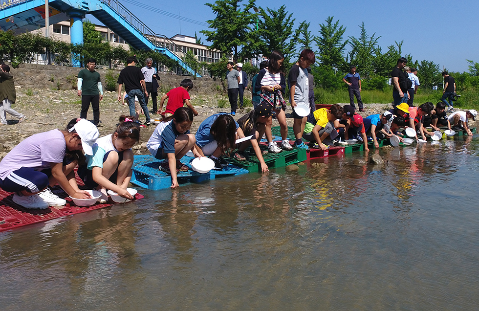 ▲19일 1300리 낙동강 상류지류인 강원 태백시 상장초등학교 인근 황지천에서 김연식 태백시장을 비롯한 학생 40여명, 주민 등이 참여한 가운데 향토어종인 뱀장어 방류 행시가 열리고 있다. ⓒ태백시