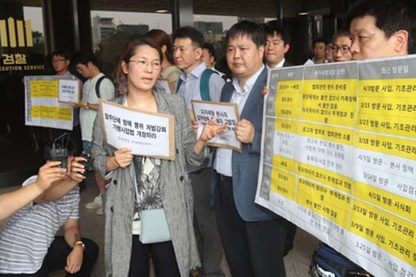 이날(20일) 전국가맹점주협의회연석회의와 참여연대 민생희망본부는 가맹본부의 불공정행위에 대응하고자 단체 모임을 조직한 가맹점주를 사찰하고 이른바 '블랙리스트'를 작성하는 등 가맹점주의 단체 활동을 방해했다는 이유로 ㈜에땅 공재기·공동관 공동대표와 피자에땅 가맹본사 직원 5명을 업무방해와 명예훼손, 개인정보보호법 위반 혐의로 서울중앙지검에 고발했다.