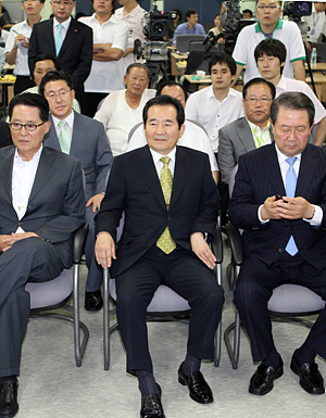 정세균 민주당 대표는 이날 밤 10시가 넘어 당사 상황실에 모습을 드러내 간단한 인사만 한 뒤 곧바로 자리를 떴다. 정 대표는 굳은 표정으로 "국민의 뜻을 겸허히 받들겠다"는 말만을 남겼다.