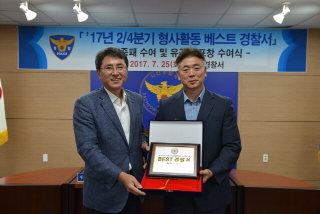 사천경찰서는 25일 오전 11시 경찰서 2층 회의실에서 황철환 경남지방경찰청 형사과장이 참석한 가운데 2017년 2/4분기 형사활동 평가 베스트 경찰서로 선정, 인증패 수여 및 우수 형사 1명에 대하여 표창장 수여식을 가졌다.