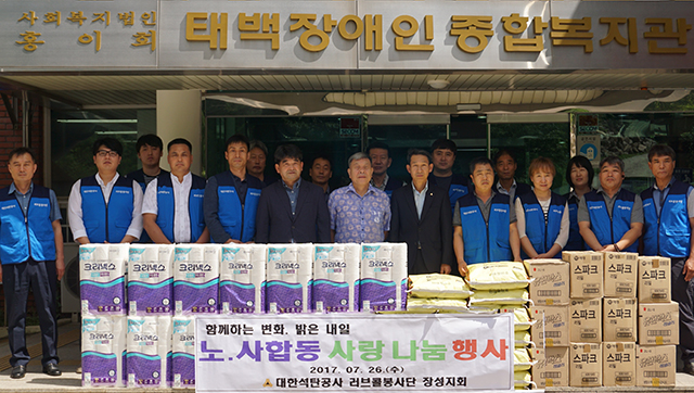 강원 태백시 장성동 대한석탄공사 러브콜봉사단 장성지회는 26일 관내 장애인 재활시설인 태백장애인종합복지관에서 노·사 합동 사랑 나눔 행사를 가졌다.